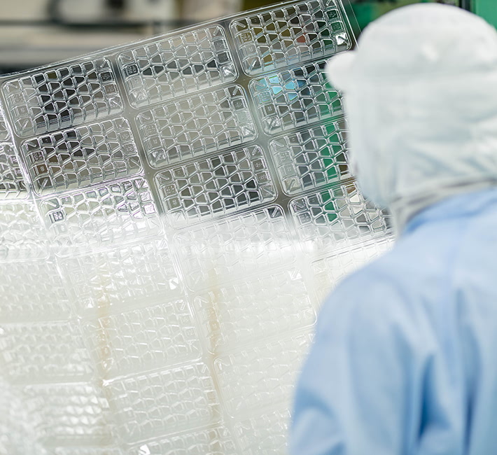 品質基準を満たすトレイを効率的に生産することで、製品の信頼性を確保しています。
