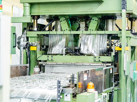 フィルムを機械に投入し、圧縮エアーと真空吸引により金型へ押し付けて成型する